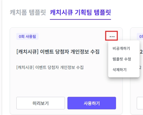 등록한 템플릿 카드에서 우측 상단 [···] 클릭하면 비공개, 수정, 삭제가 가능합니다.