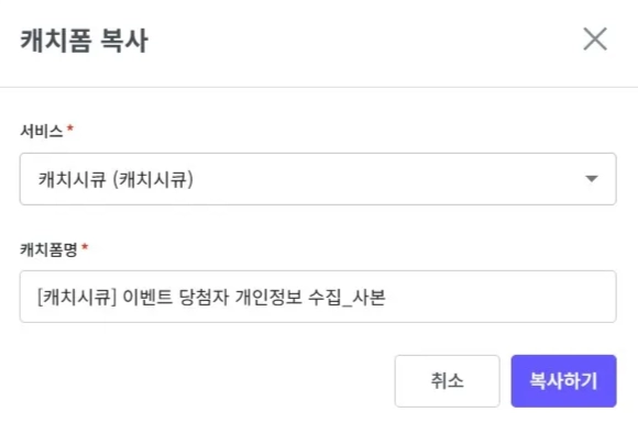 서비스 간 복사: 복사할 서비스와 원본 캐치폼이 위치한 서비스 모두에 대한 권한이 있어야 서비스 간 복사가 가능합니다.