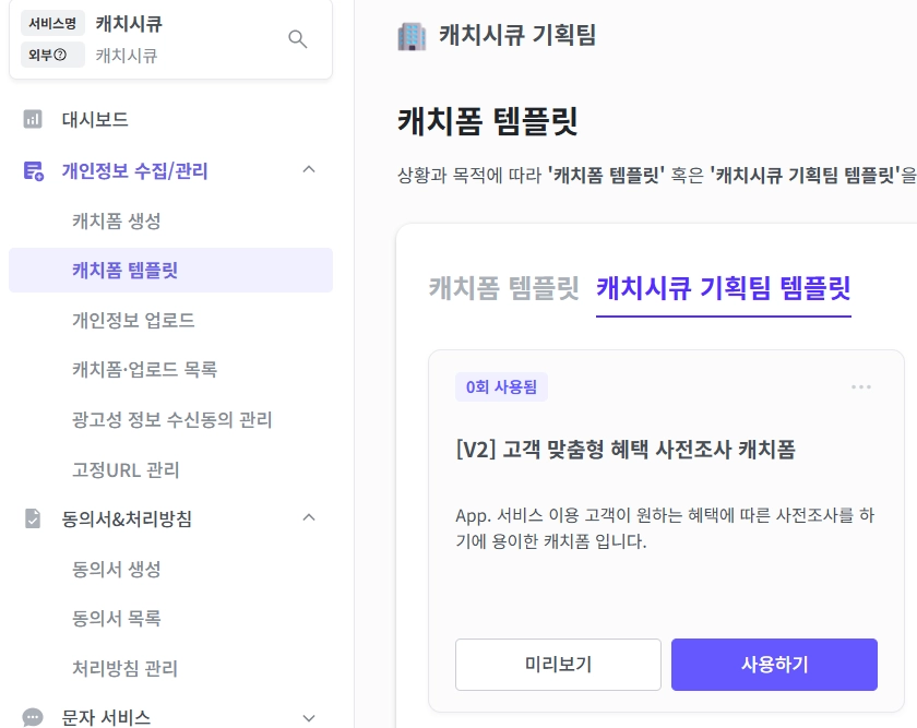메뉴 > 개인정보 수집/관리 > 캐치폼 템플릿 > [(회사명/부서명) 템플릿]