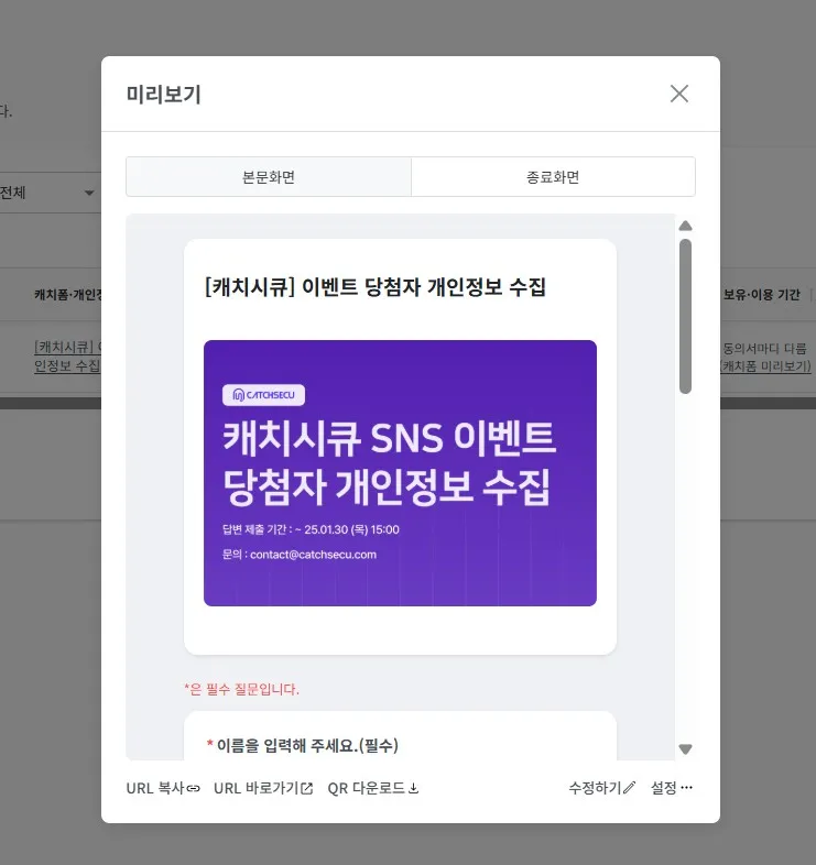 캐치폼 공개 시, 고객(정보주체)에게 노출되는 '본문 화면'과 '종료 화면'을 미리 확인할 수 있습니다