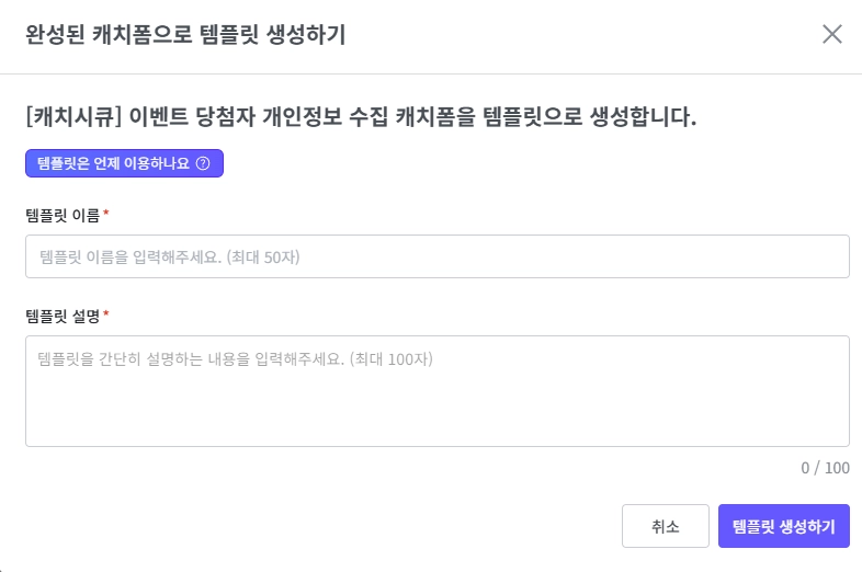 다른 사용자(구성원)들이 쉽게 찾고 이해할 수 있도록 ‘템플릿 이름’과 ‘템플릿 설명’을 입력 후, 템플릿을 생성하기를 클릭해 주세요.
