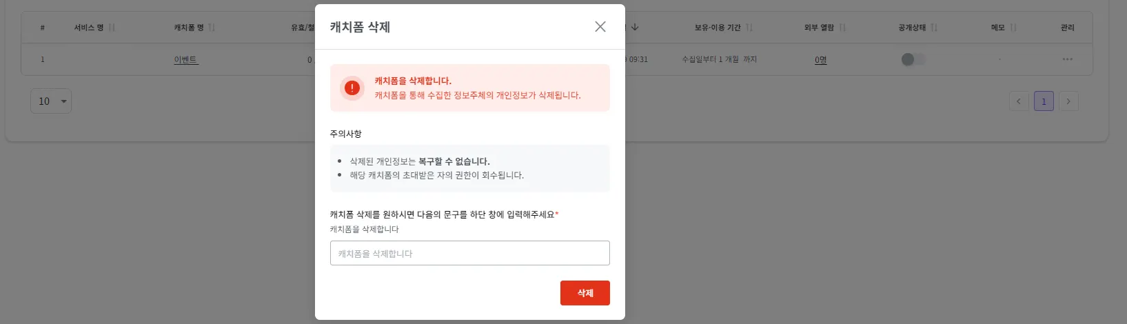 문구를 그대로 입력 후 ‘삭제’ 버튼을 클릭하면 캐치폼이 삭제됩니다.