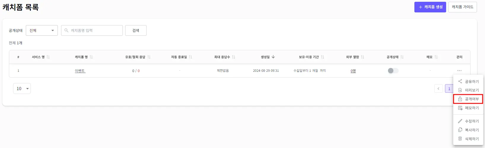 수정하고자 하는 캐치폼의 우측에 관리 > 공개여부를 클릭해 주세요.
