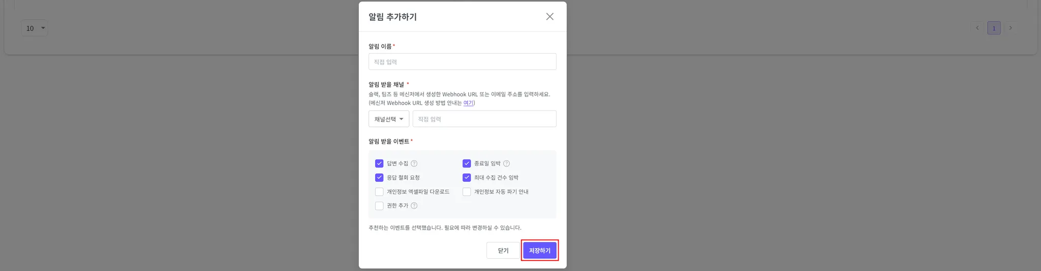 마지막으로 ‘알림 받을 이벤트’를 선택한 후 ‘저장하기’ 버튼을 클릭해 주세요.