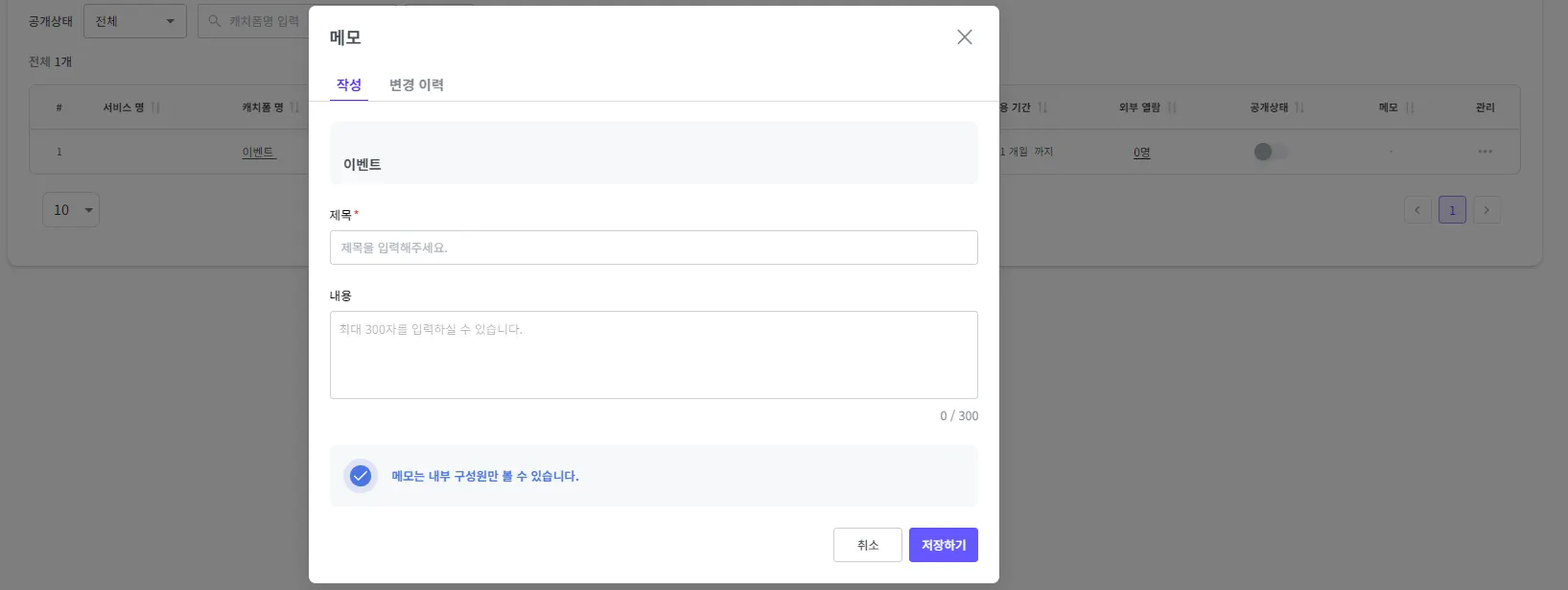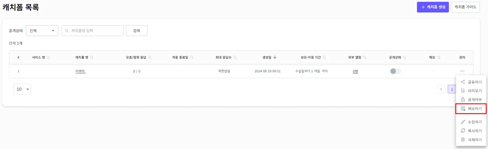수정하고자 하는 캐치폼의 우측에 관리 > 메모하기를 클릭해 주세요.