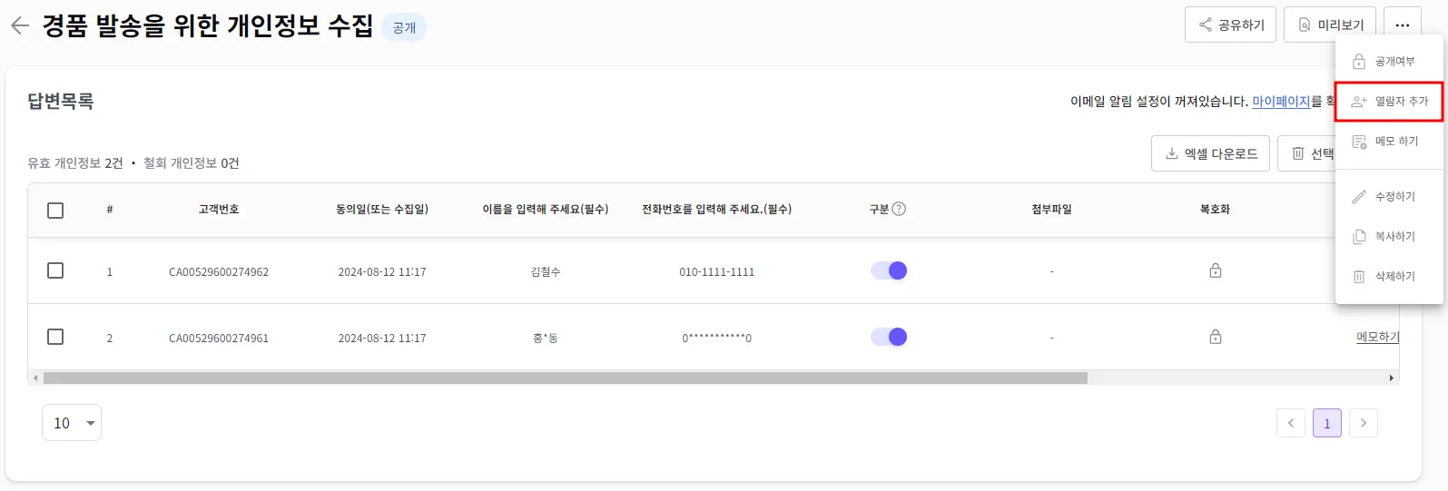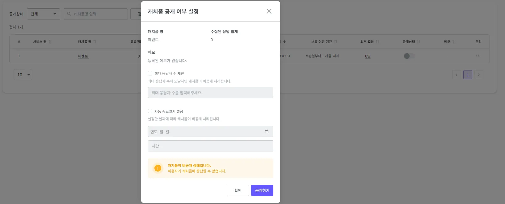 최대 응답자 수, 자동 종료일시 설정 시 캐치폼을 비공개 설정 후 수정이 가능합니다.