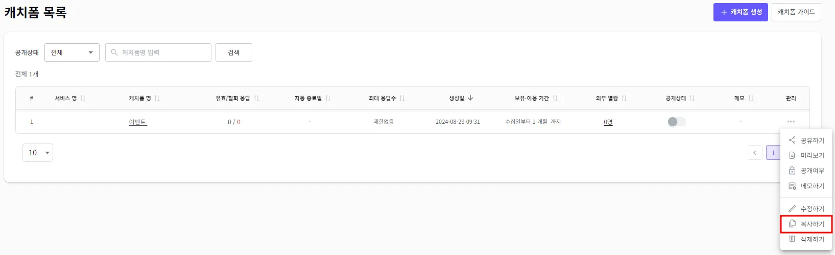 수정하고자 하는 캐치폼의 우측에 관리 > 복사하기를 클릭해 주세요.