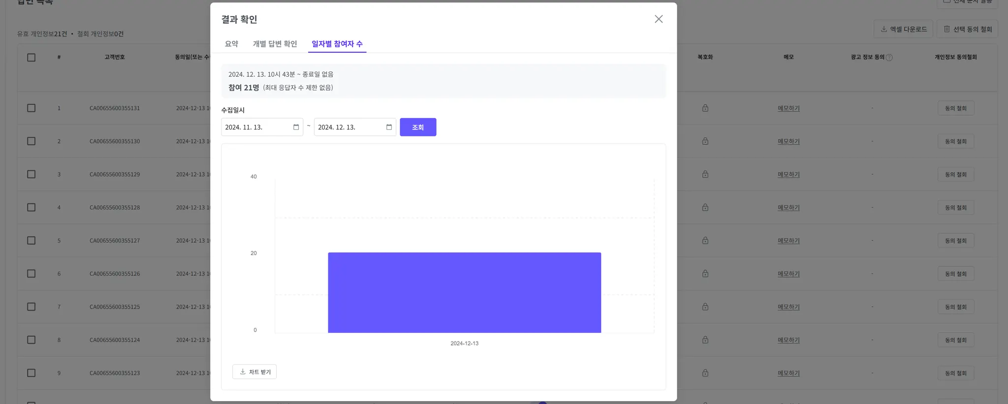 일자별로 참여자 수의 통계를 확인할 수 있습니다.