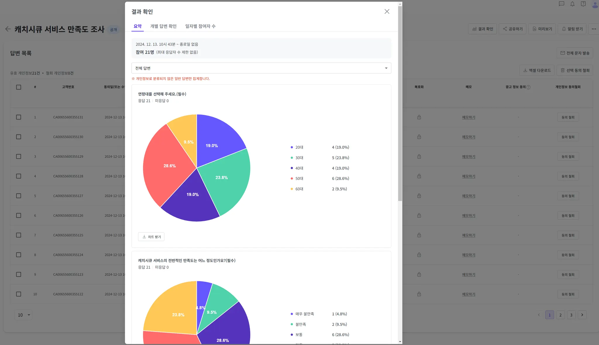개인정보로 분류되지 않은 답변의 통계를 확인할 수 있습니다.