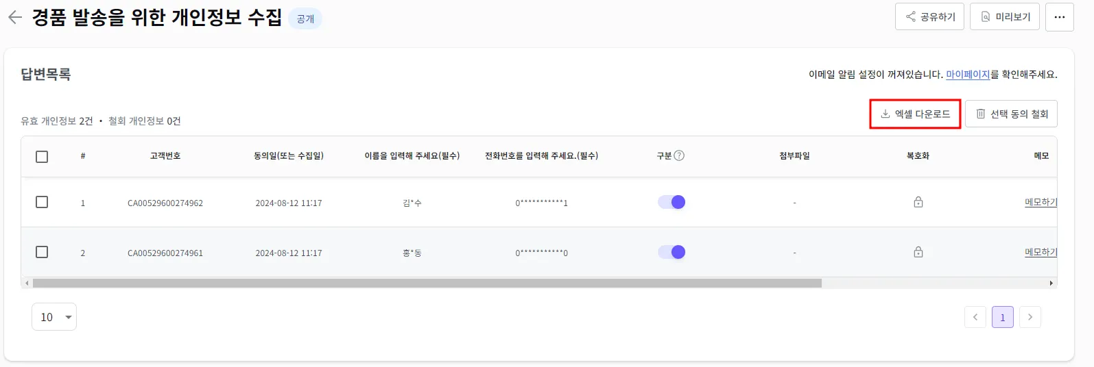 해당 캐치폼을 통해 수집한 개인정보가 완전히 삭제되며, 복구할 수 없습니다.