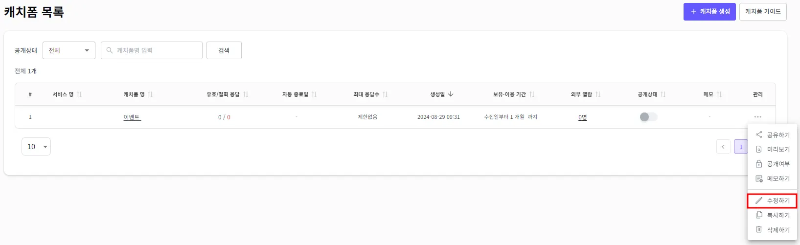 수정하고자 하는 캐치폼의 우측에 관리 > 수정하기를 클릭해 주세요.