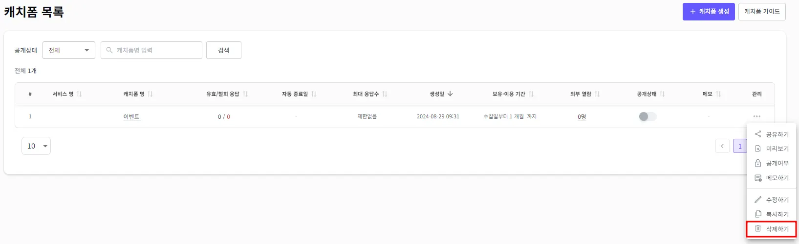 수정하고자 하는 캐치폼의 우측에 관리 > 삭제하기를 클릭해 주세요