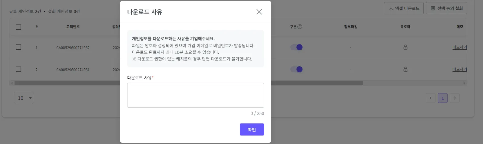 다운로드 사유를 입력하고 ‘확인’ 버튼을 클릭해 주세요.