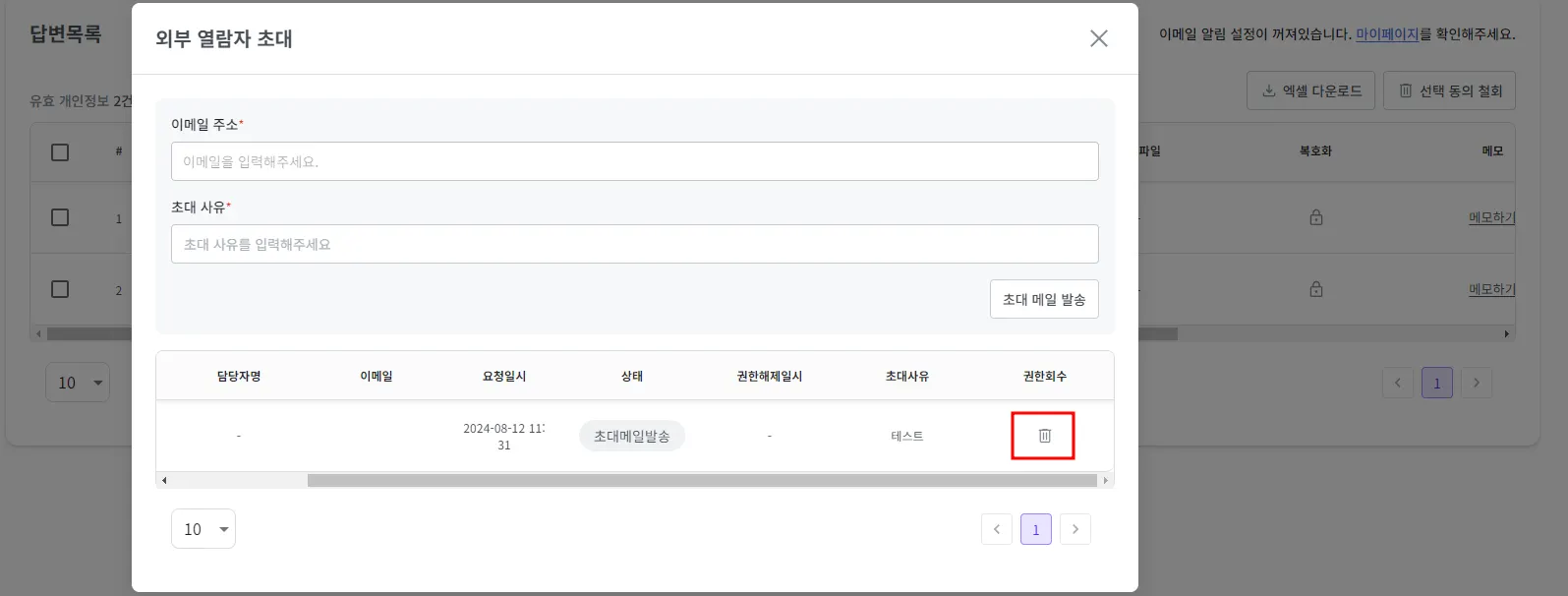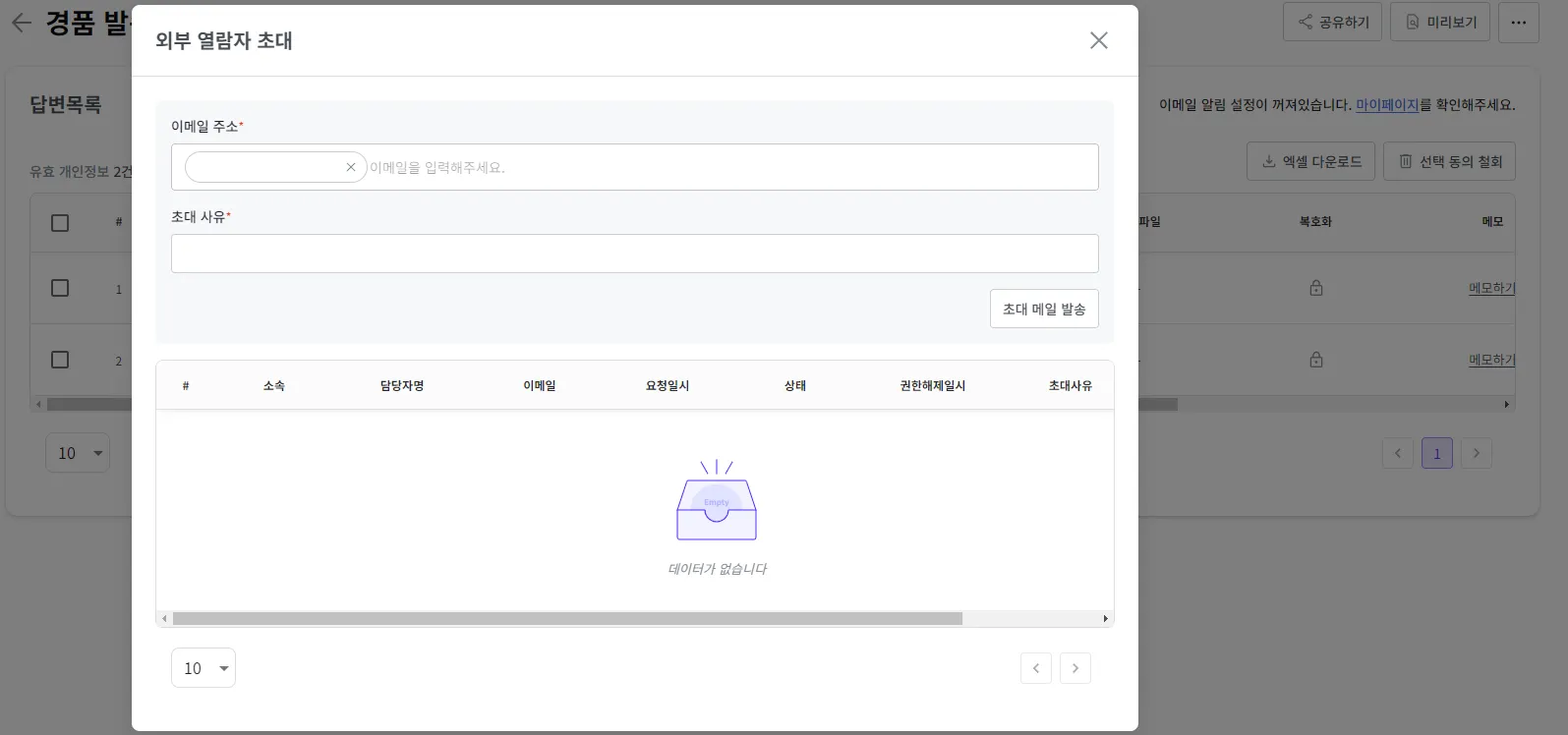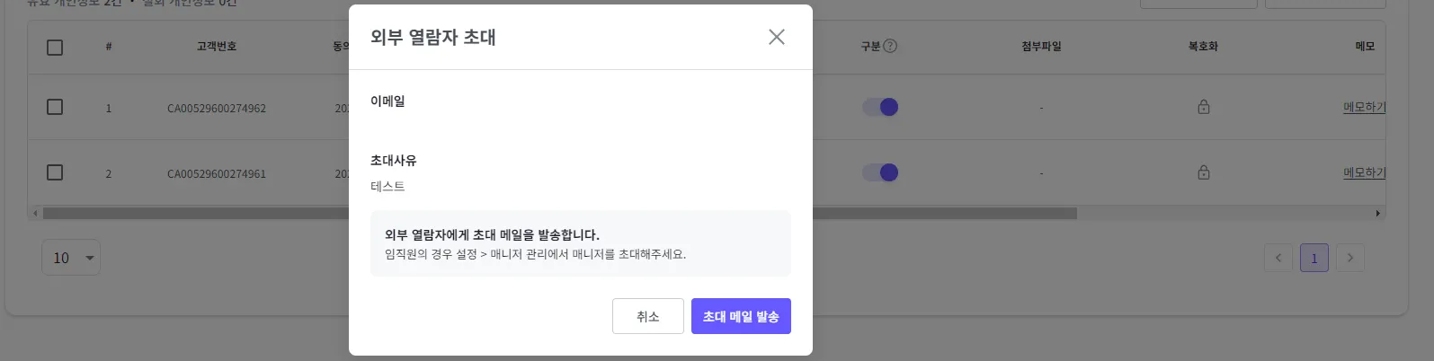 추가할 열람자의 이메일과 초대 사유를 입력 후 ’초대 메일 발송’ 버튼을 클릭해 주세요.