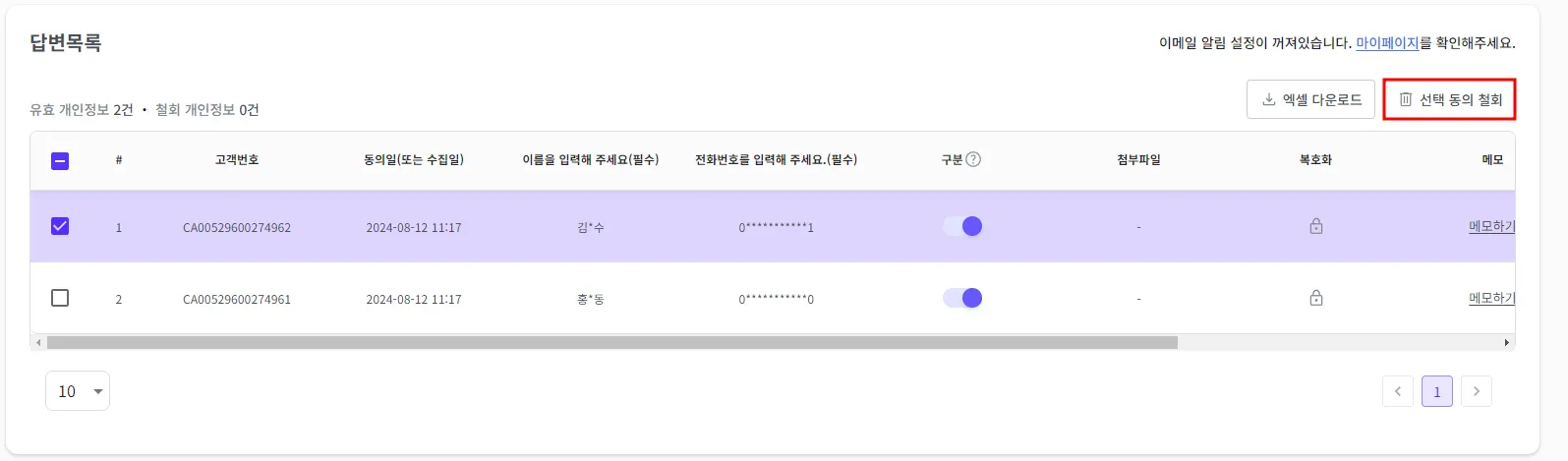 우측 상단에 ‘선택 동의 철회’ 버튼을 클릭해 주세요.