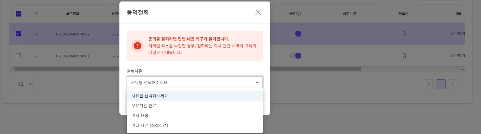 사유를 선택 후 ‘동의철회’ 버튼을 클릭해 주세요.