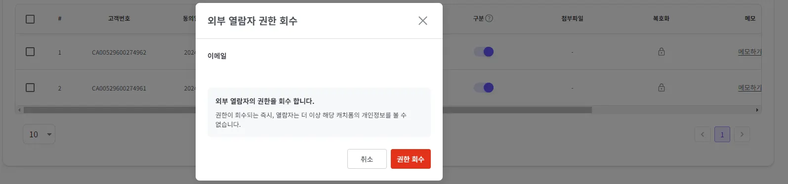 ‘권한 회수’ 버튼을 클릭해 주세요.
