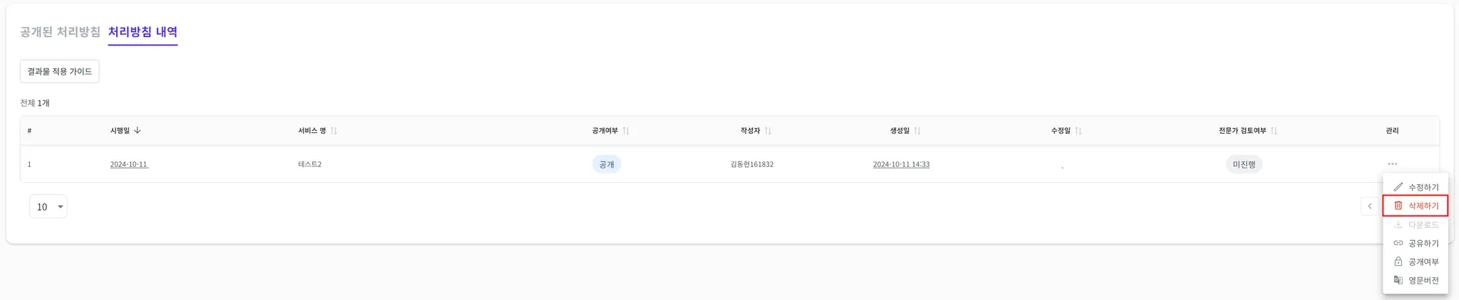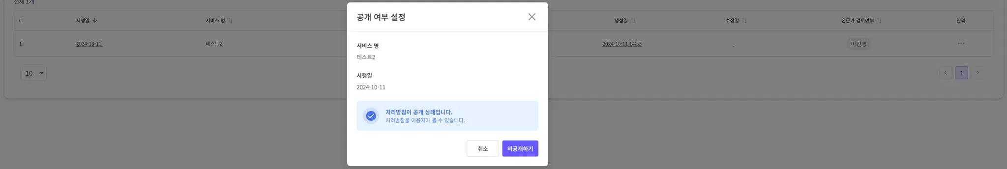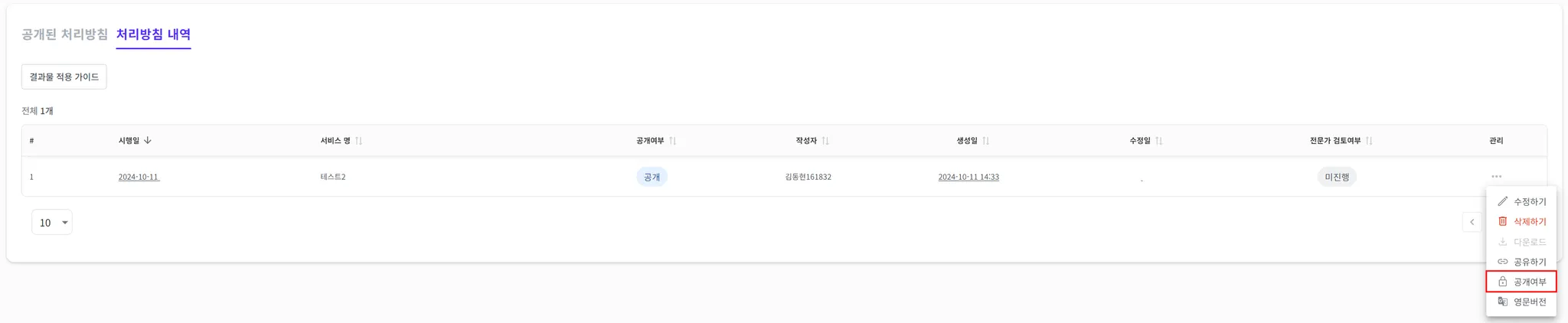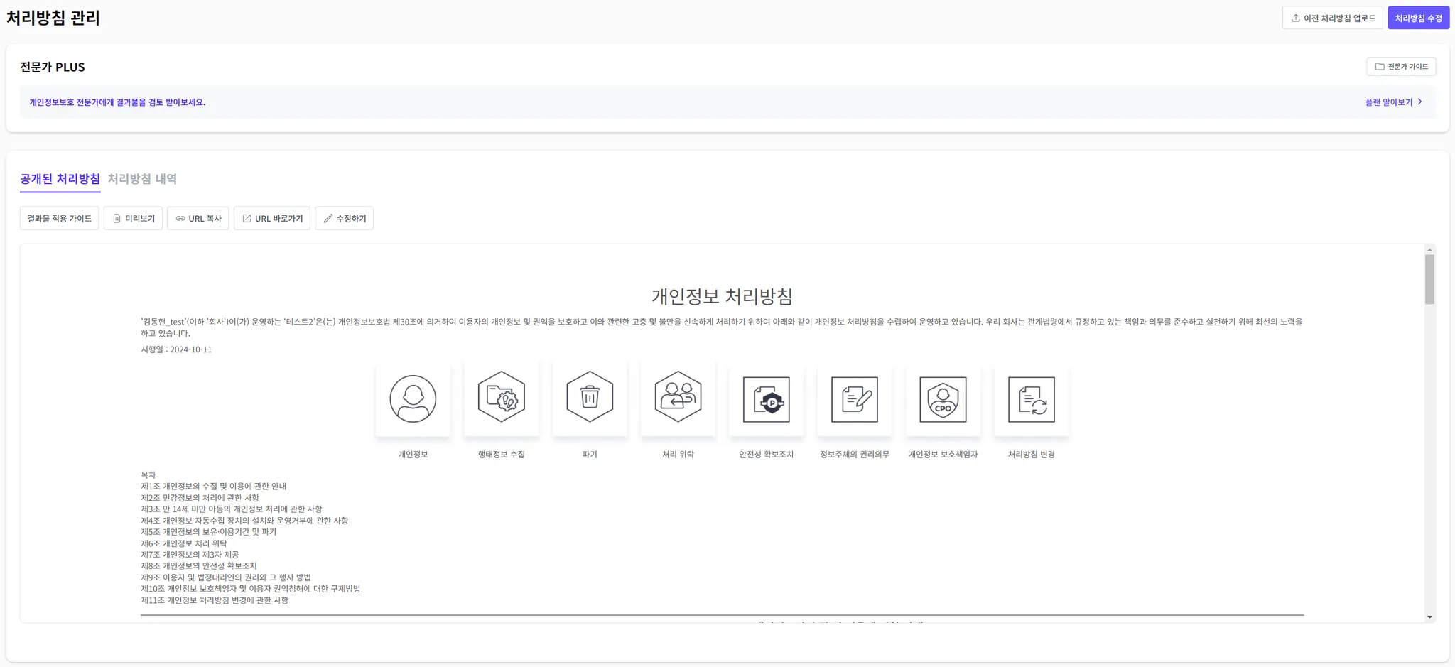처리방침을 생성하면 왼쪽 하단에 ‘처리방침 내역’에서 확인할 수 있습니다.