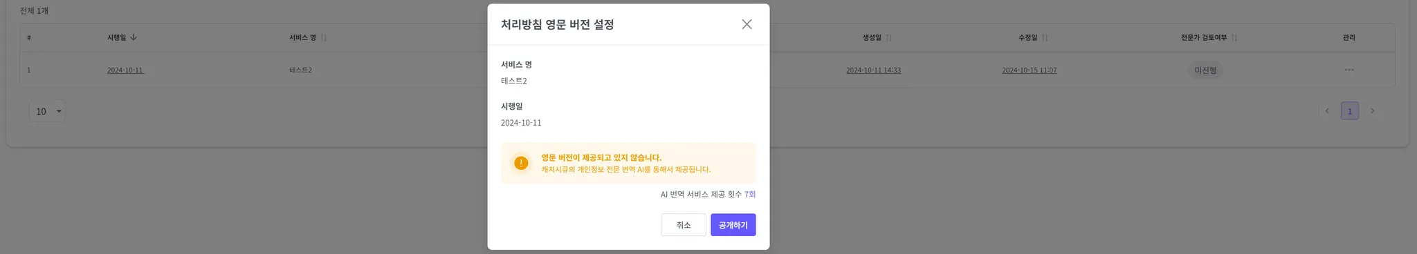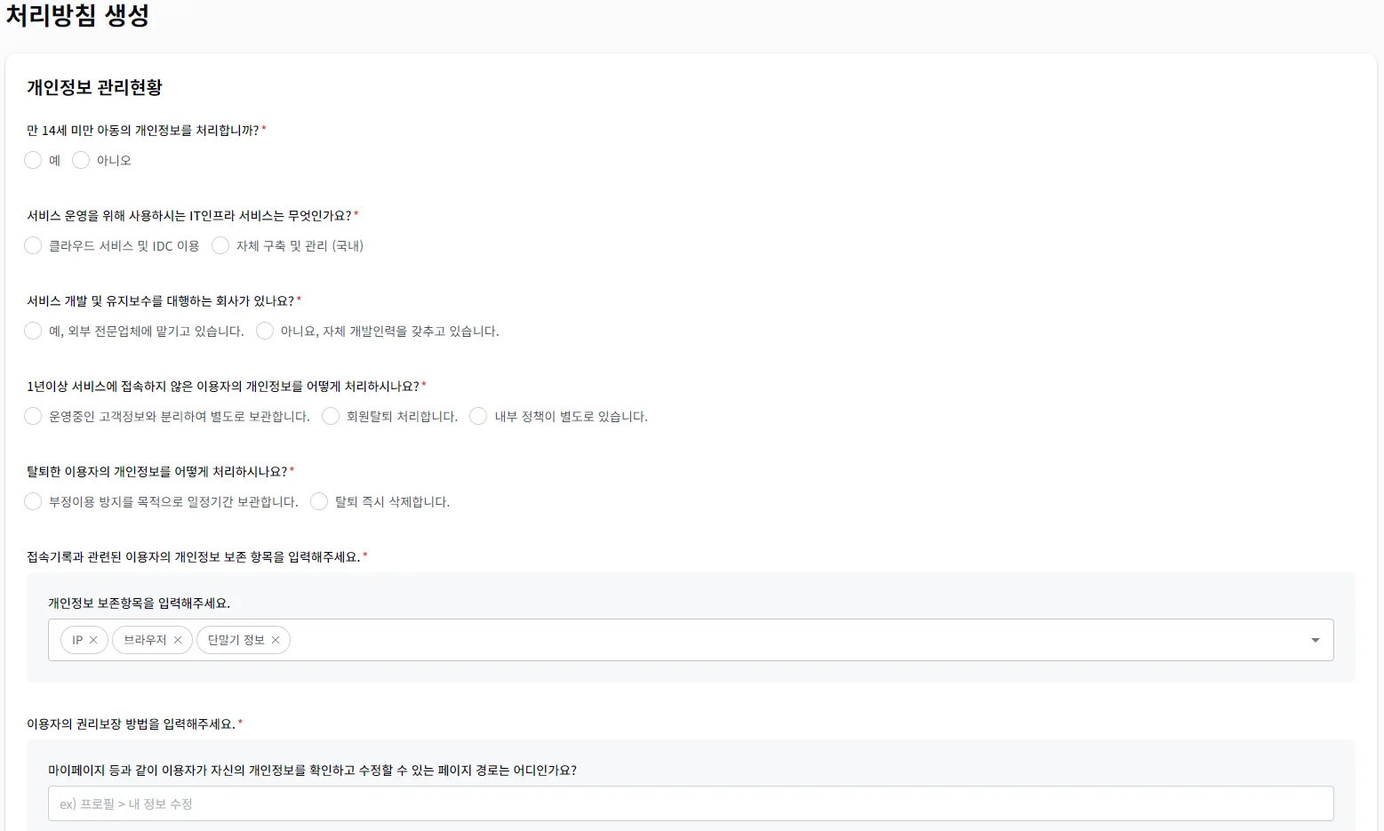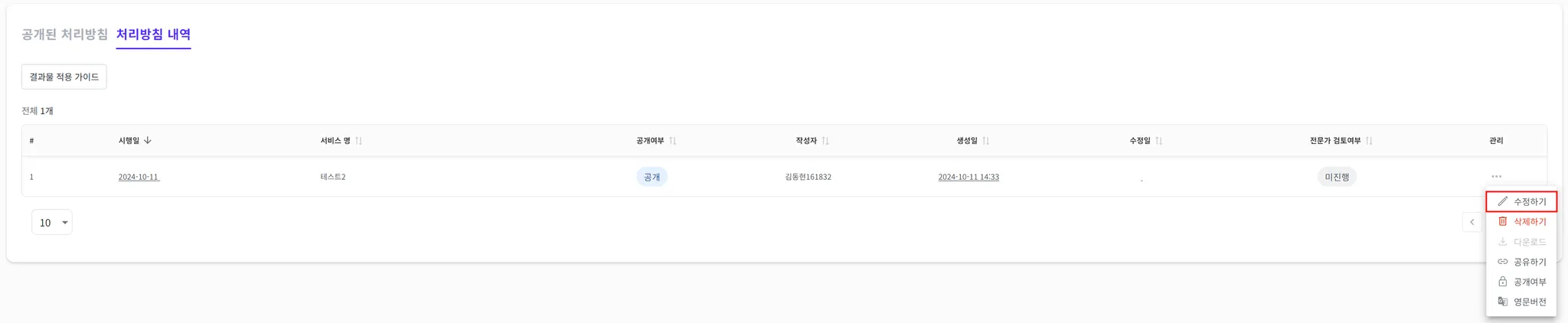 처리방침을 생성하면 왼쪽 하단에 ‘처리방침 내역’에서 확인할 수 있습니다.