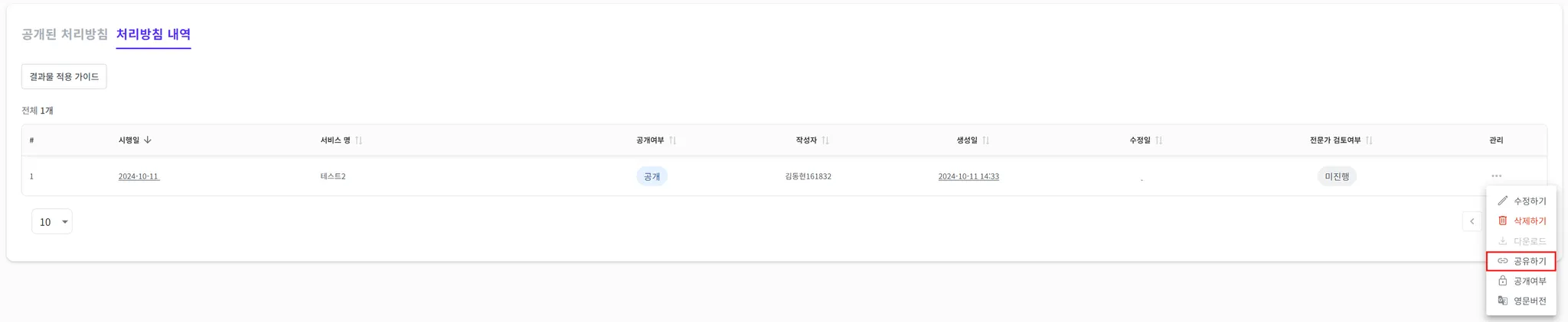 ‘개인정보처리방침 내역’에서 수정할 처리방침 항목의 관리 > 공유하기를 클릭해 주세요.