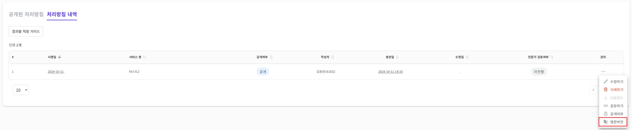 ‘개인정보처리방침 내역’에서 수정할 처리방침 항목의 관리 > 영문버전을 클릭해 주세요.