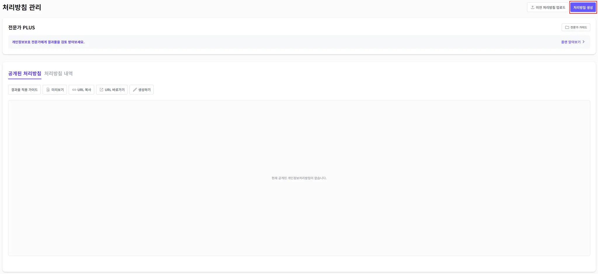 우측 상단에 ‘처리방침 생성’ 버튼을 클릭해 주세요.
