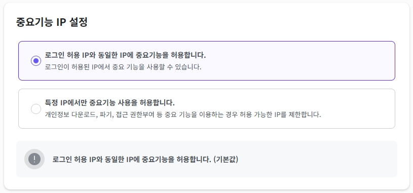 별도의 특정 IP에서만 중요 기능 사용을 허용할 경우, ‘중요기능 허용 IP 목록’ 설정을 진행해주세요.