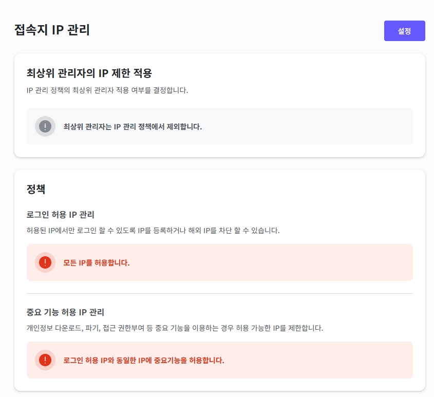 설정한 정책을 요약해서 볼 수 있으며, 로그인 허용 IP / 중요기능 허용 IP를 별도로 설정했을 경우, 하단의 목록에서 확인이 가능합니다.