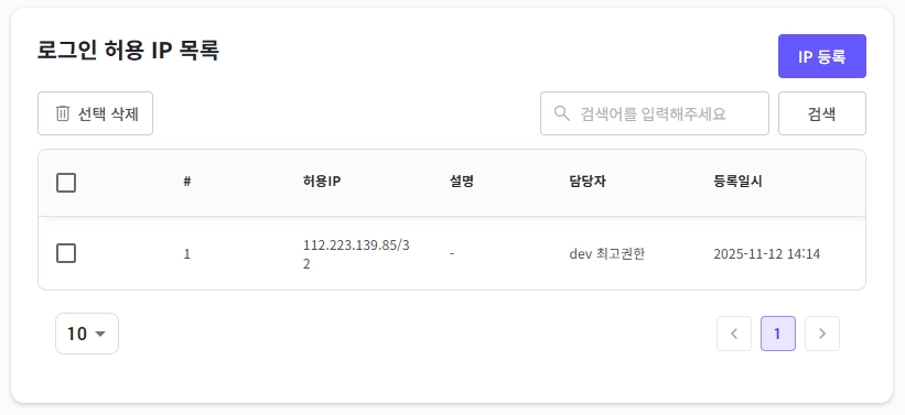 리스트 우측의 ‘IP 등록’버튼을 눌러 IP를 추가할 수 있습니다.