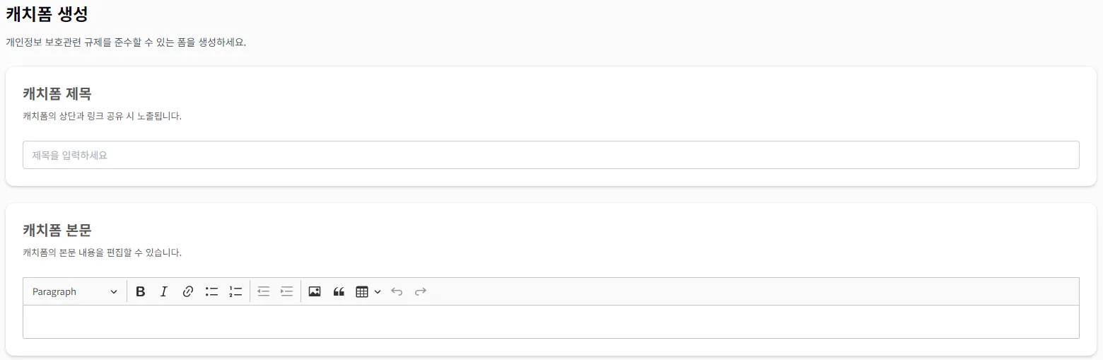 선택한 템플릿의 문항, 동의서(수집·이용 / 제3자 제공), 동의서 노출 방식, 종료화면 등을 일부 수정해 원하는 형태의 캐치폼을 만들 수 있습니다.