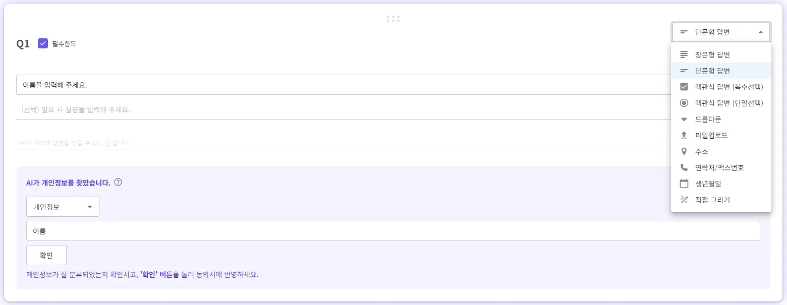 AI가 질문에서 개인정보를 찾으면 분류 여부를 확인하고 ‘확인’ 버튼을 눌러주세요.