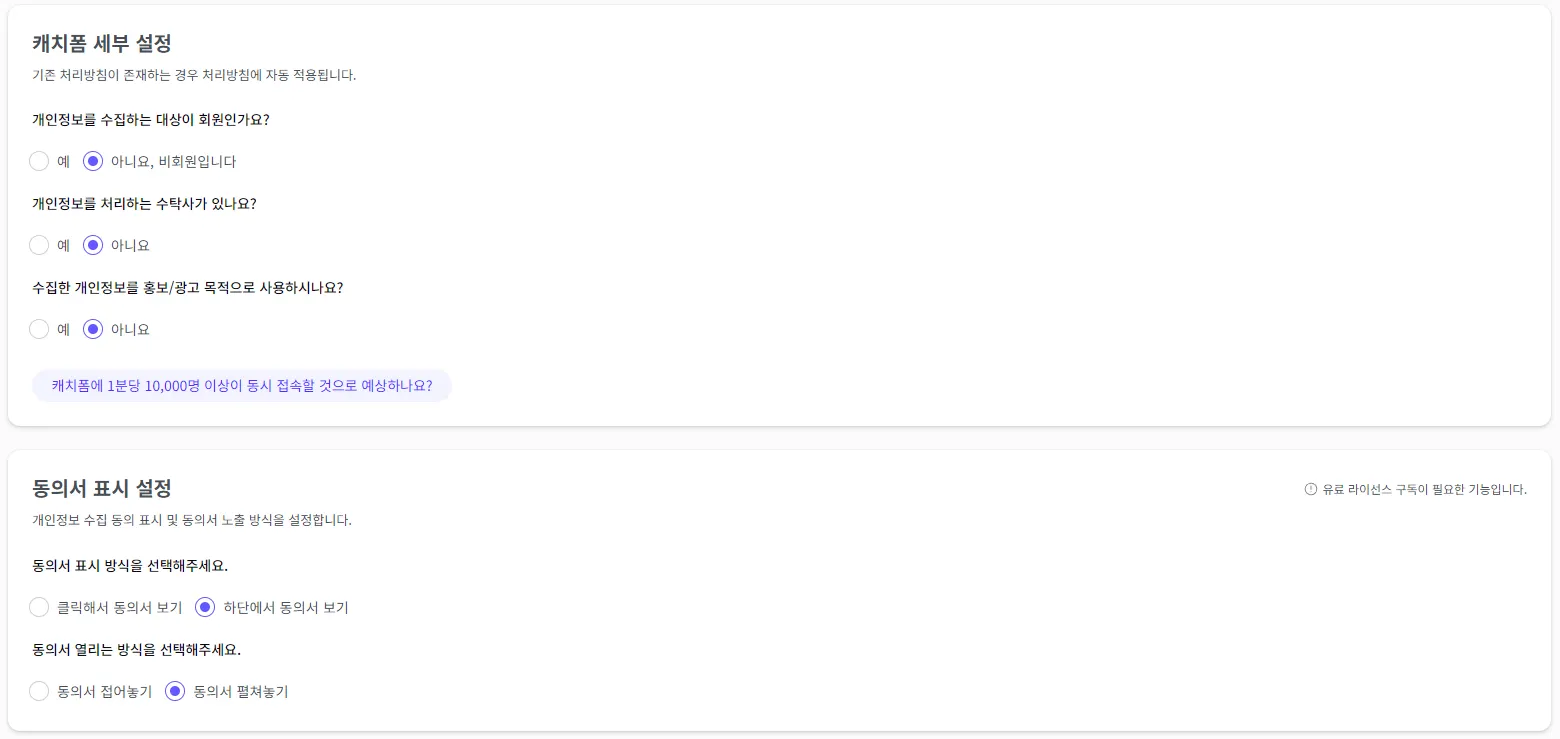 캐치폼 세부 설정과 동의서 표시 설정을 설정해 주세요.