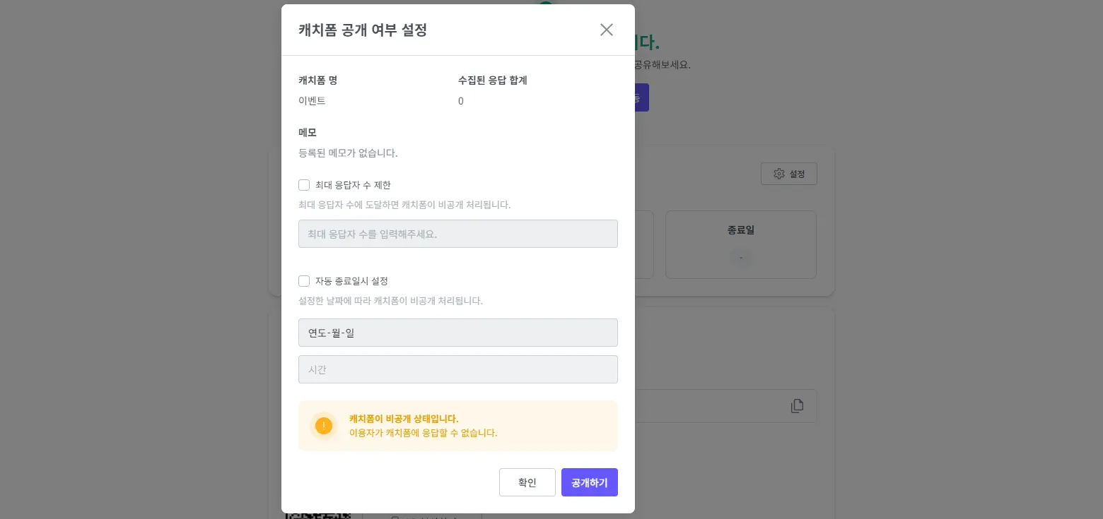 최대 응답자 수를 설정하면 최대 응답자 수 도달 시 캐치폼이 비공개 처리됩니다.