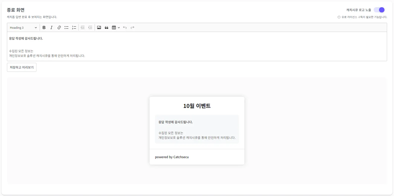 종료 화면과 캐치시큐 로고 노출을 설정해 주세요.