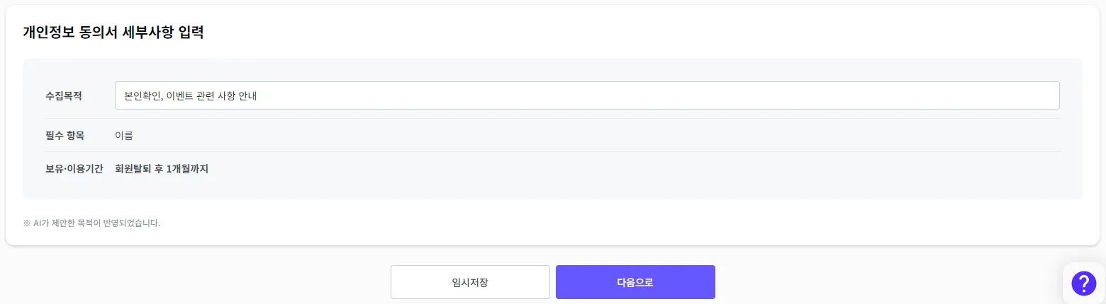 개인정보 동의서에 반영될 세부사항을 확인하고 ‘다음으로’ 버튼을 눌러주세요.