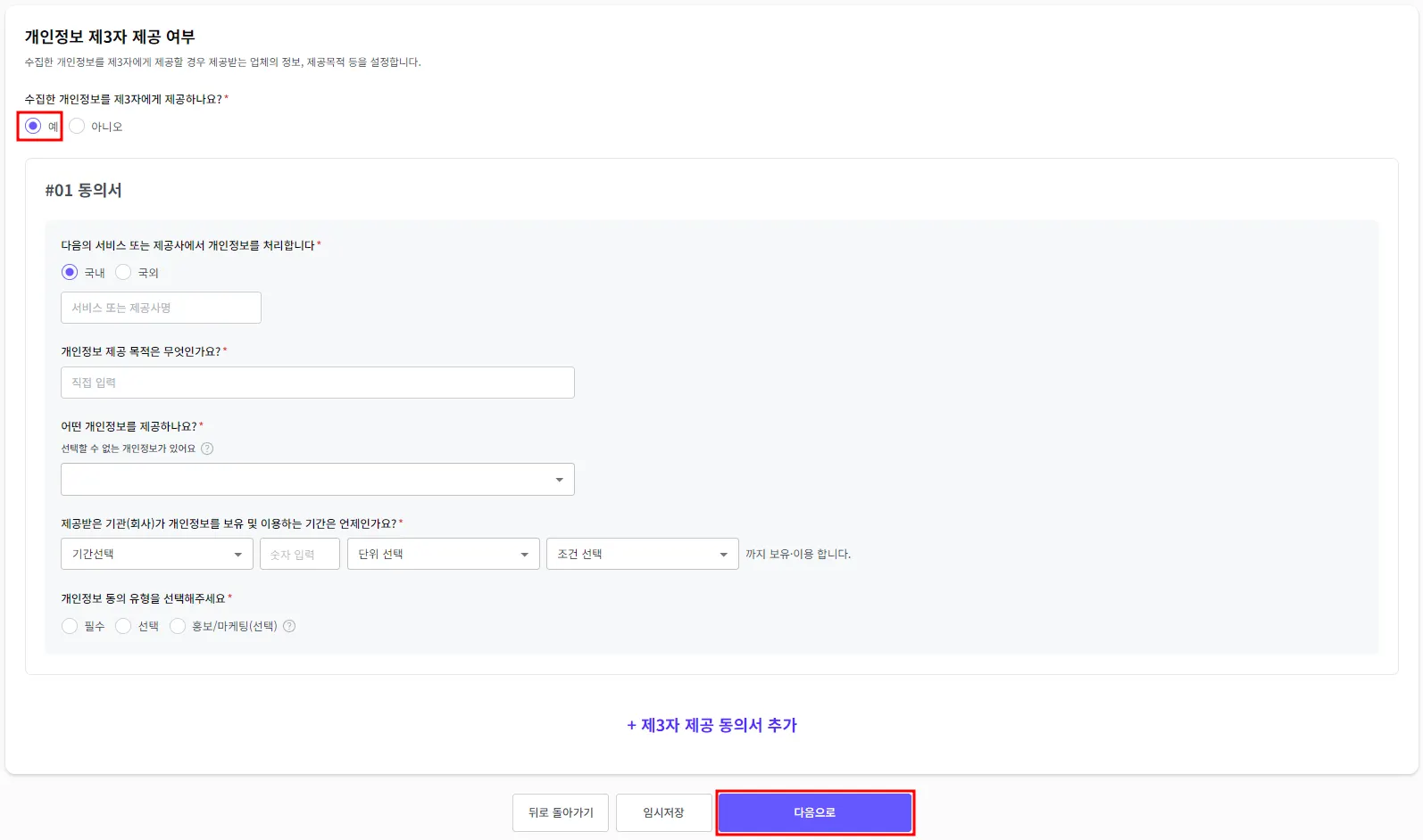 ‘수집한 개인정보를 제3자에게 제공하나요?’ 질문에 ‘예’에 체크를 해주세요.