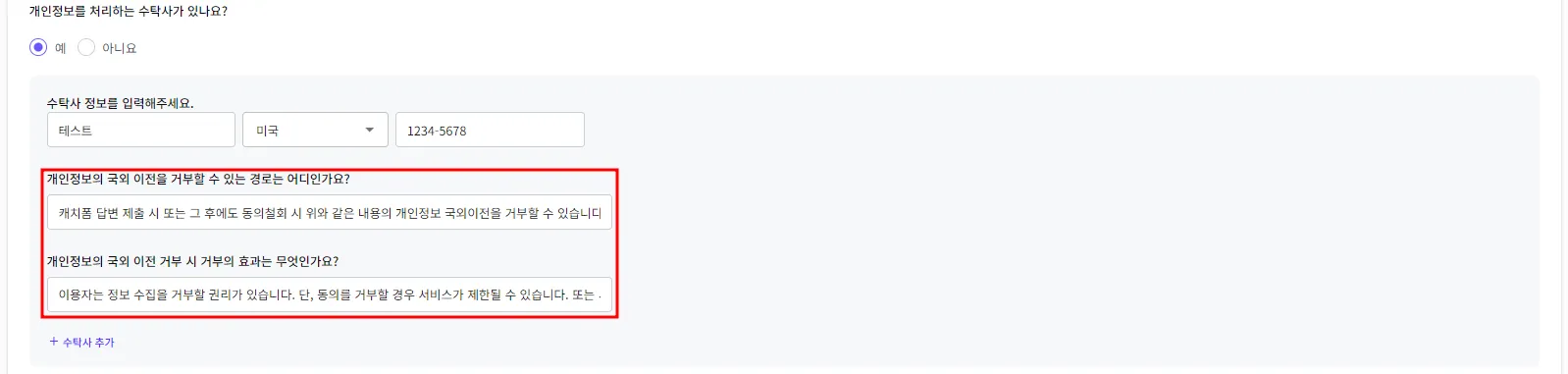 개인정보를 처리하는 수탁사가 국외인 경우 이전 거부 방법과 거부 효과를 표시할 수 있습니다.