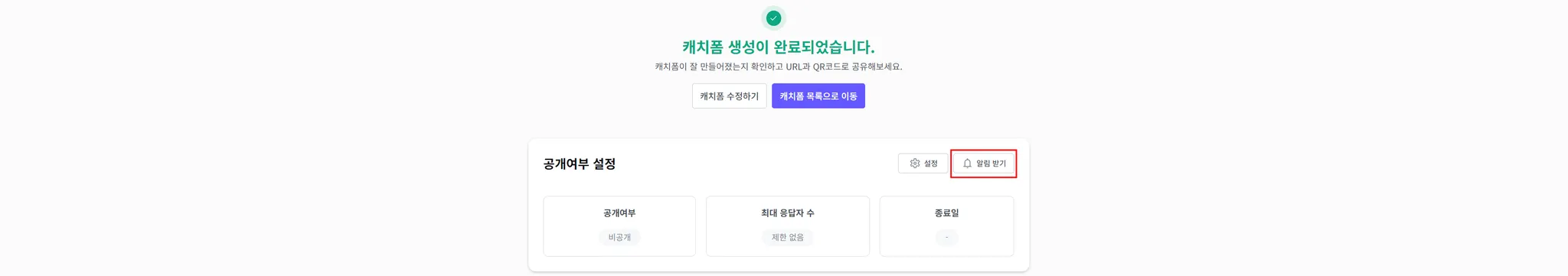 생성한 캐치폼에 대해 알림을 받고 싶다면 ‘공개여부 설정’에 ‘알림 받기’ 버튼을 클릭해 주세요.