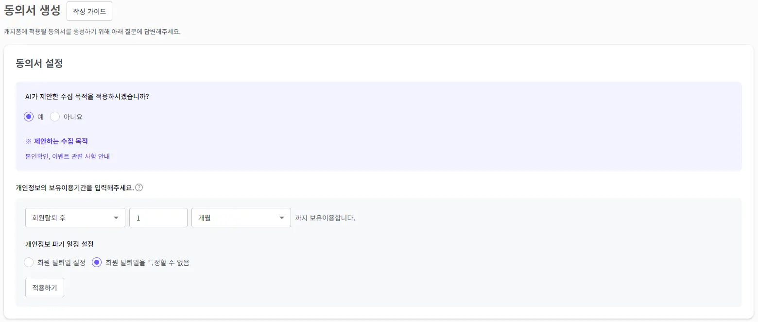 개인정보 보유·이용 기간을 입력하고 ‘적용하기’ 버튼을 눌러 동의서에 반영해 주세요.
