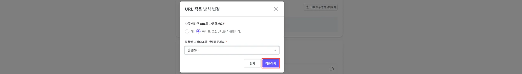 적용할 고정URL을 선택 후 ‘적용하기’ 버튼을 클릭해 주세요.