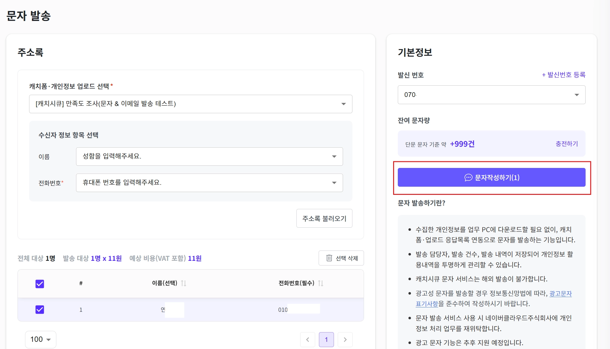 ② [캐치폼-업로드 목록] 에서 문자 발송