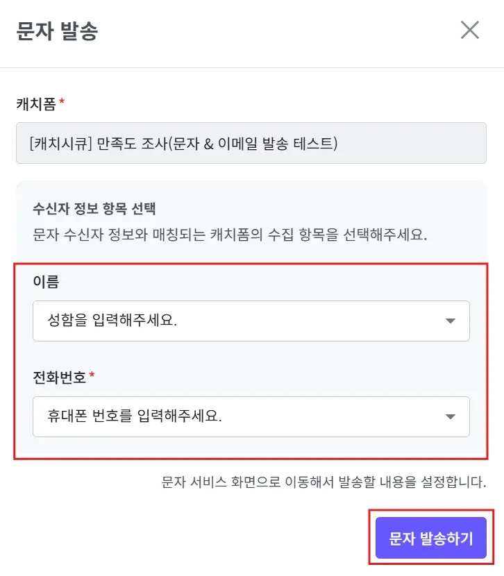 [수신자 정보 항목 선택] 창에서 이름과 전화번호가 수집되는 문항을 선택 후, “문자 발송하기” 버튼을 클릭해 주세요.