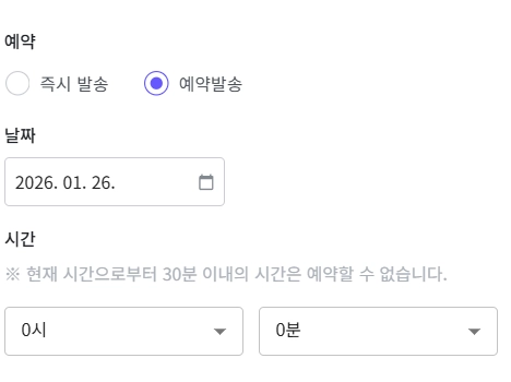 현재 시간으로부터 30분 이내의 시간은 선택할 수 없습니다.