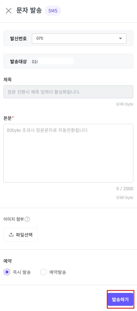 예약 방법을 선택 후 ‘발송하기’ 버튼을 클릭해 주세요.