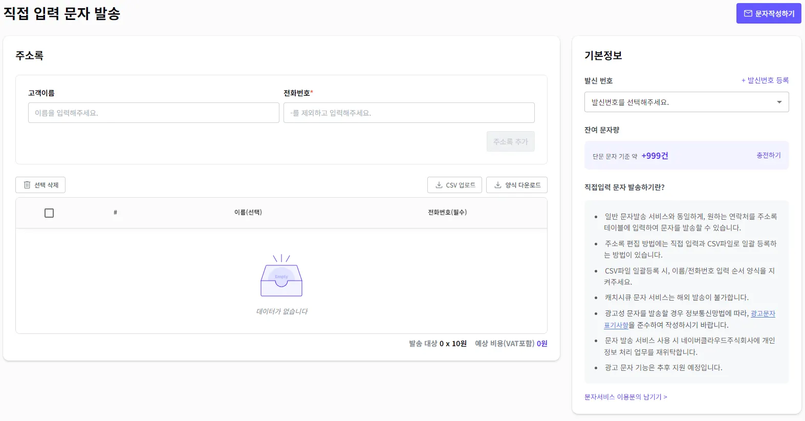 캐치시큐 대시보드에 문자 서비스 > 직접 입력 문자 발송을 클릭해 주세요.
