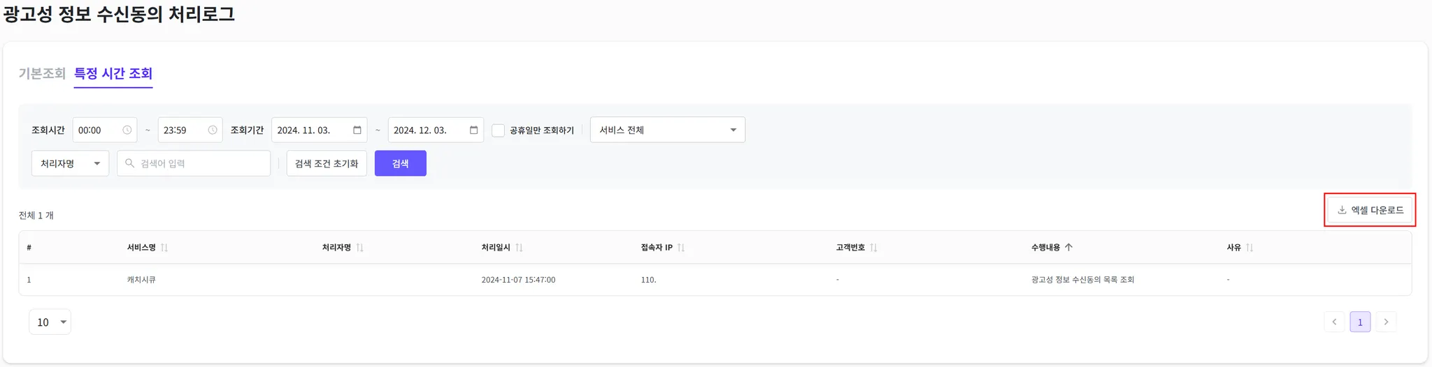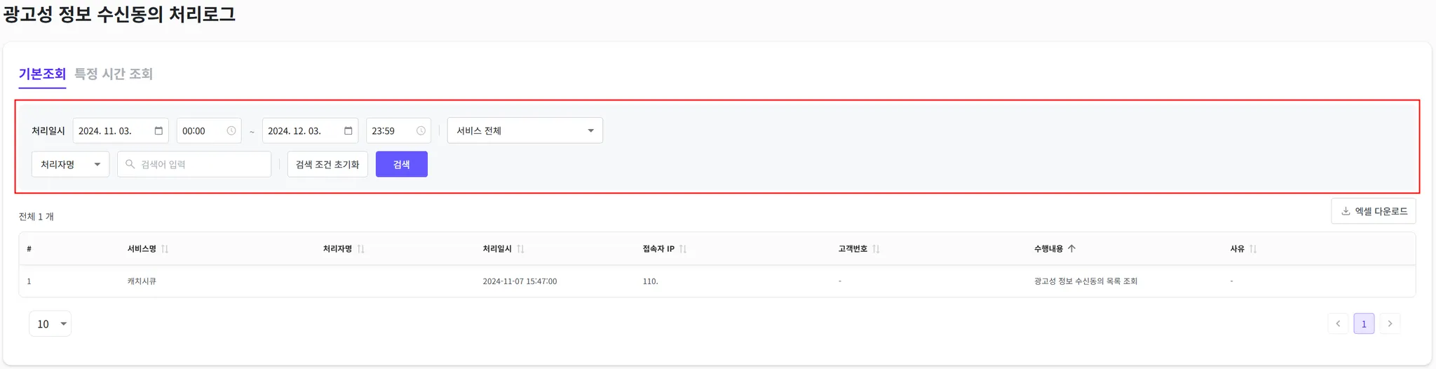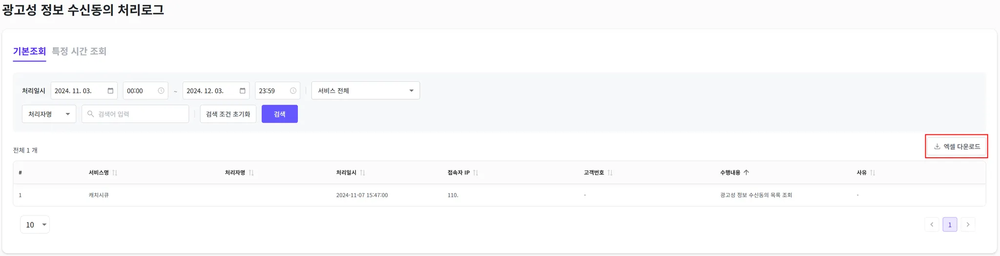 캐치시큐 대시보드에 개인정보 모니터링 > 광고성 정보 수신동의 처리로그를 클릭해 주세요.