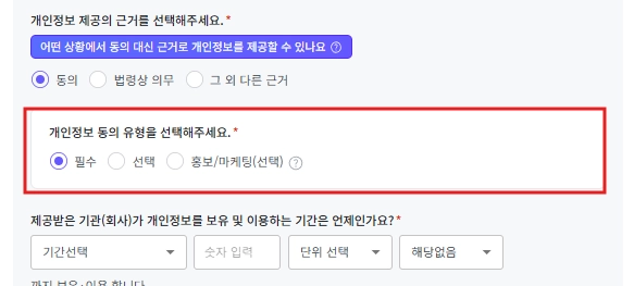 개인정보 제공시 계약/서비스 이행을 위하여 반드시 제공하여야 하는 필수항목과 반드시 제공이 필요하지는 않으나 제공받는 자의 마케팅 활동 등을 위하여 제공할 수 있는 선택항목을 나누어 표시해야 합니다. 아래처럼 필수여부에 따라 체크 또는 해제해 주세요.