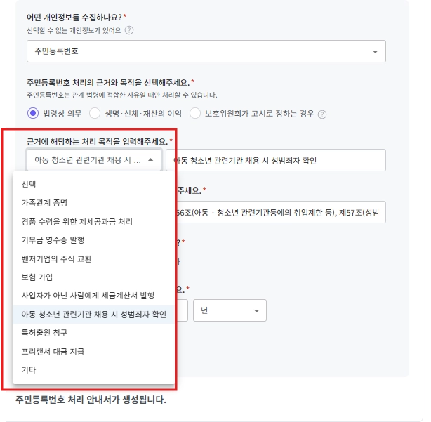 주민등록번호를 수집의 법령 근거를 선택할 수도 있고 직접 입력할 수 도 있습니다.
